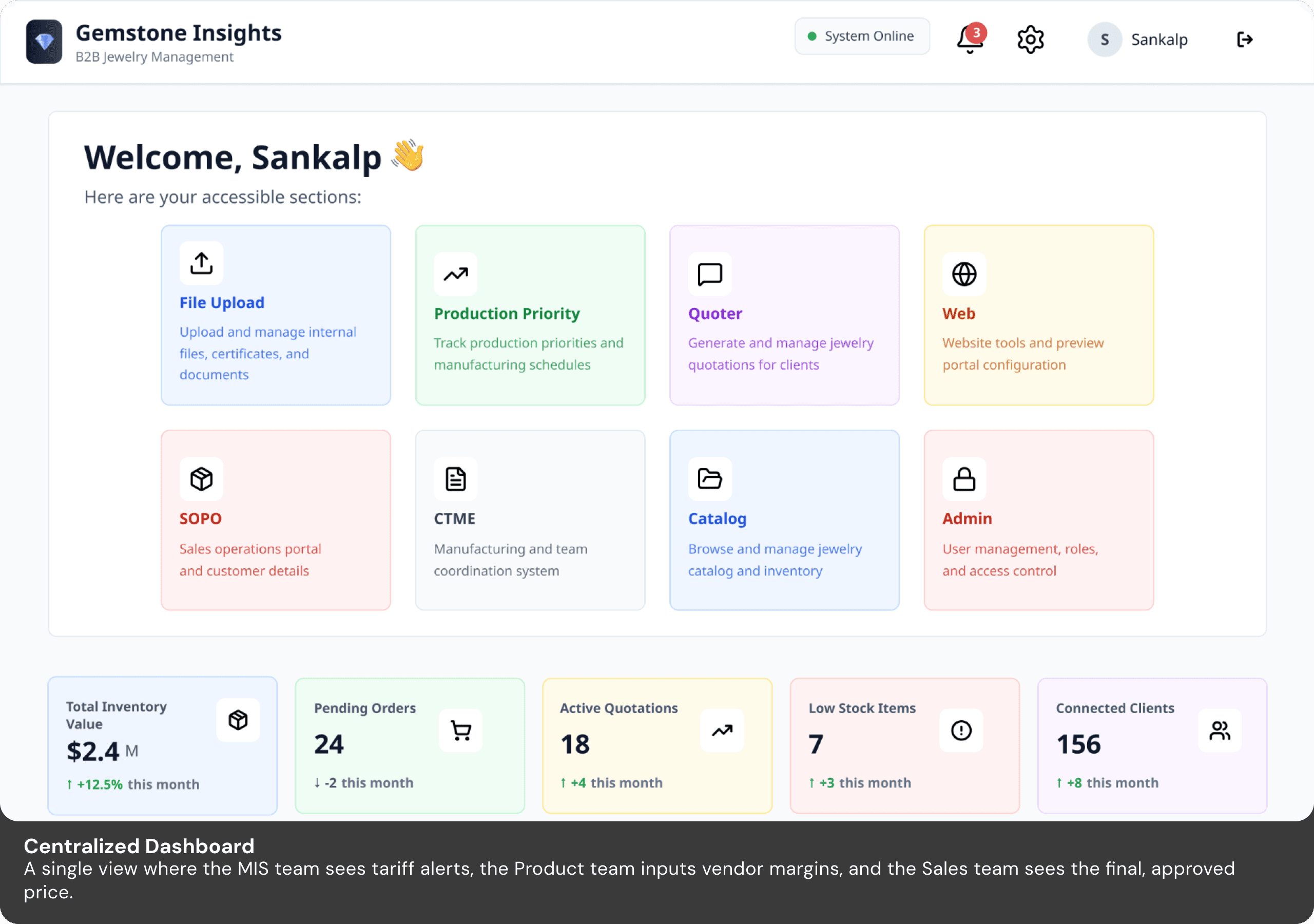 The Centralized Dashboard: A single view where the MIS team sees tariff alerts, the Product team inputs vendor margins, and the Sales team sees the final, approved price.