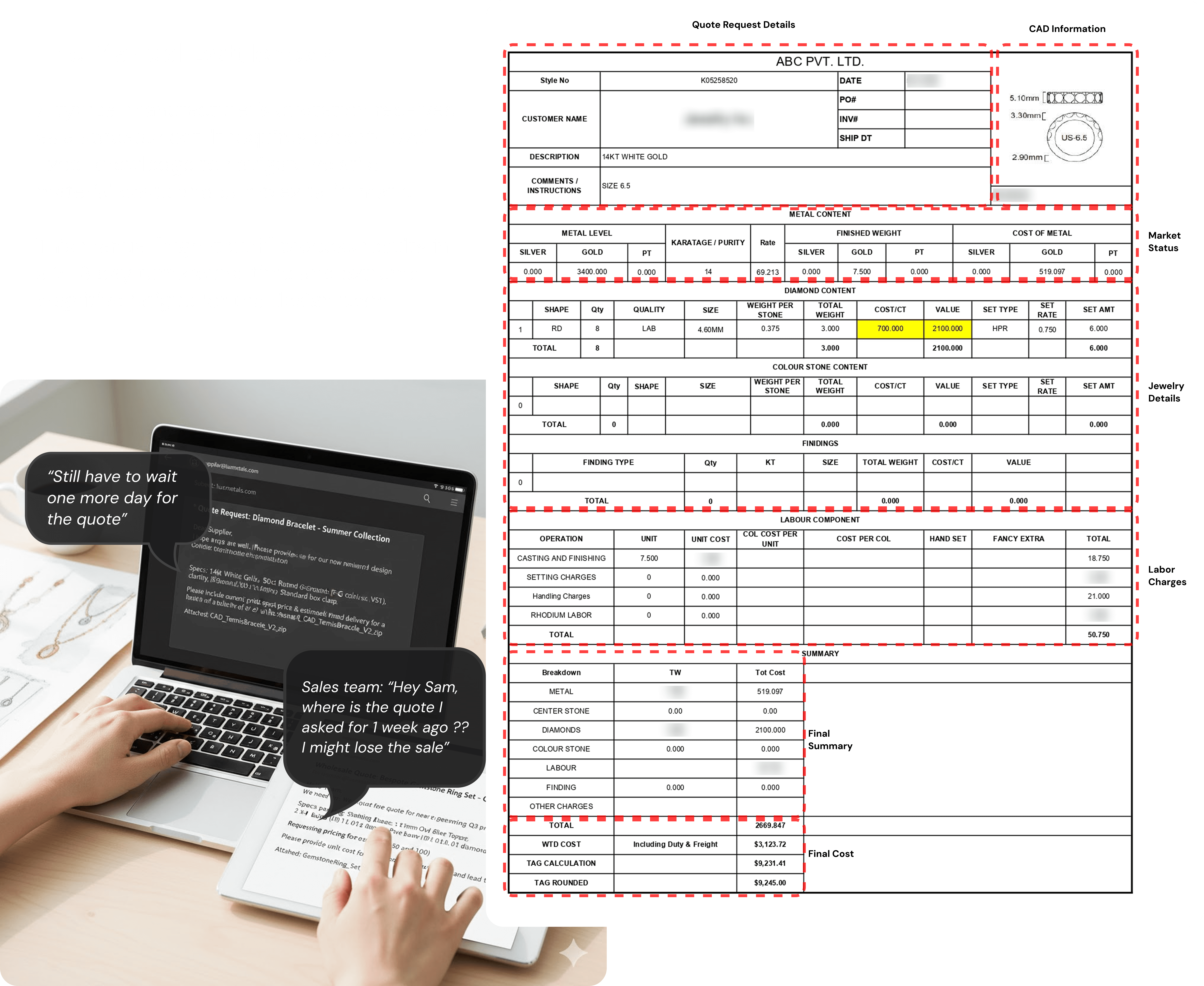A sudden hike in tariffs threw the company into chaos. Pricing jewelry became a guessing game. The Product, MIS, and Sales teams were working in silos using manual spreadsheets, leading to a 2-week turnaround time for price quotes. Retailers were losing patience, and sales were dropping.