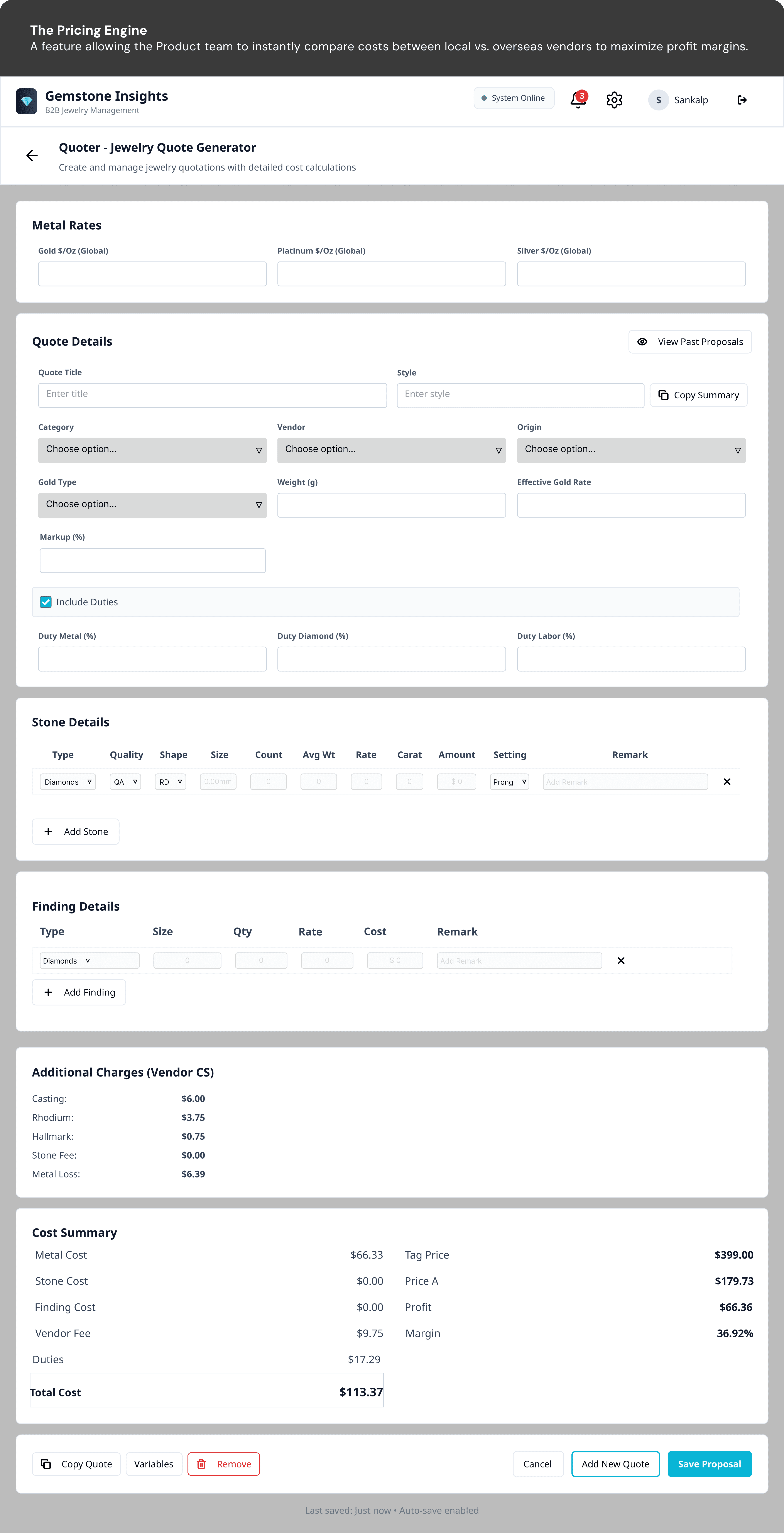 Integration (The "Brain"): We connected the tool to the ERP system for design data and Kitco.com for live precious metal rates. This allowed the system to calculate: Price = (Live Metal Rate + Vendor Margin + Tariff).