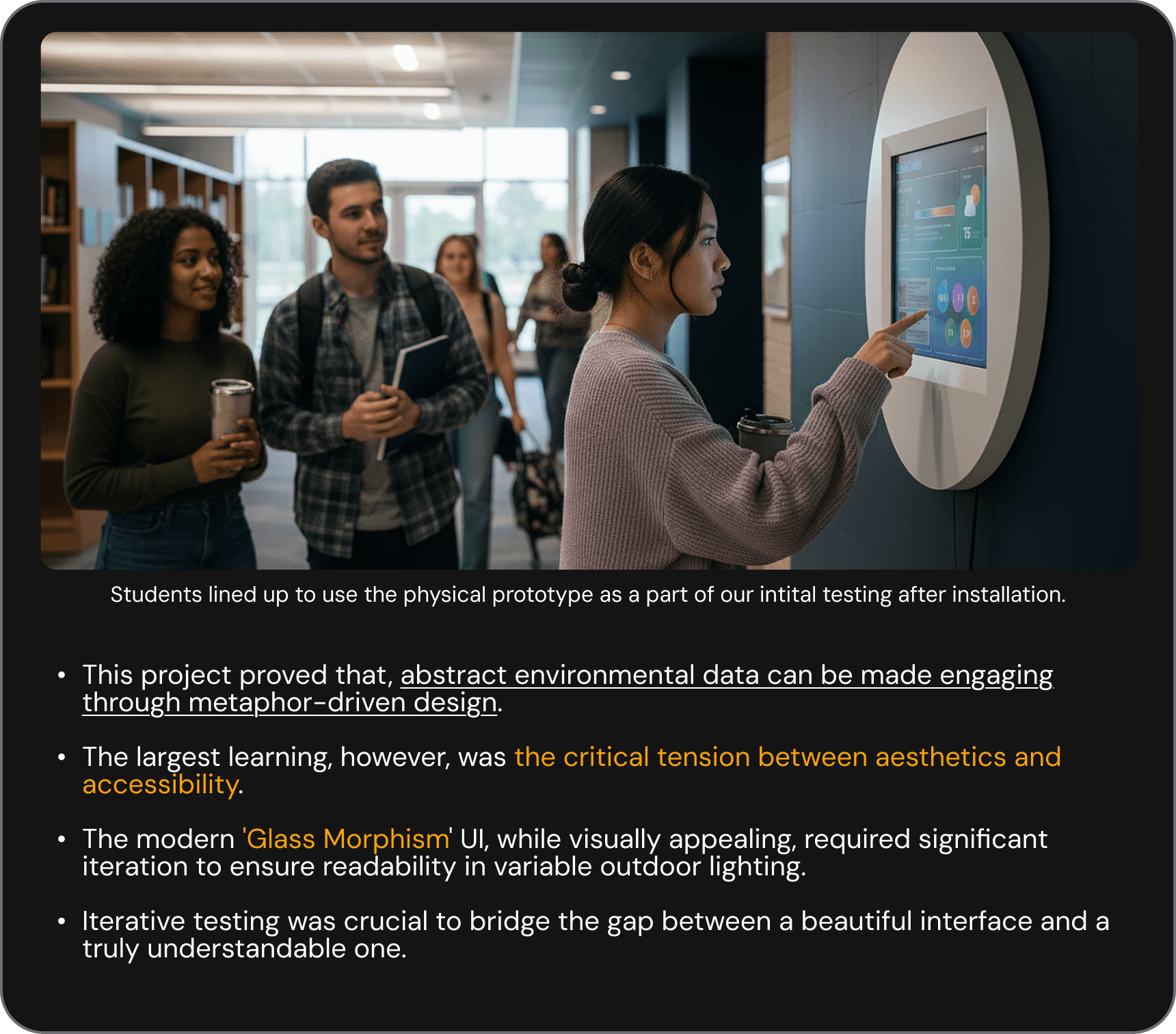 "Our initial assumption was that students wouldn't engage with environmental data. Research proved the opposite: awareness can be triggered through accessible, engaging design."