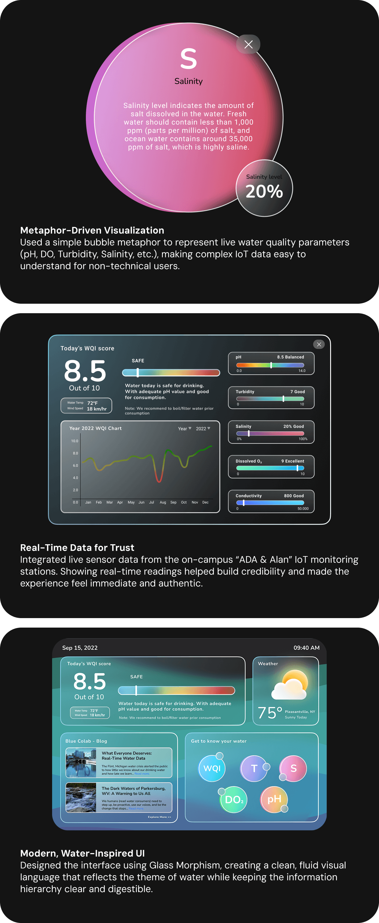 As a UX Designer, I contributed to Phase 2 of a multi-phase initiative with Blue CoLab and Pace University to create an interactive kiosk powered by IoT-based real-time water quality data.